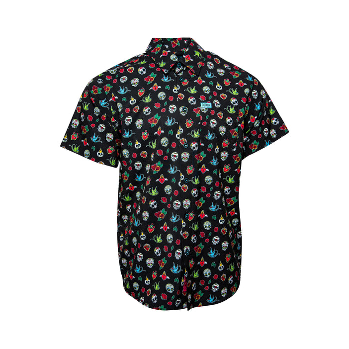 Bring bold energy to any night with the Los Muertos Short Sleeve — a black button-up featuring sugar skulls and iconic Day of the Dead artwork. Made with Dixxon’s comfortable Party Blend fabric for a striking yet effortless look.
